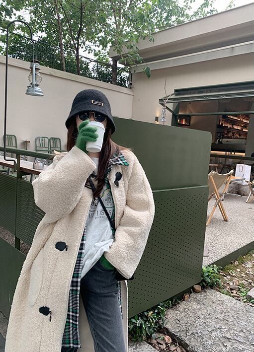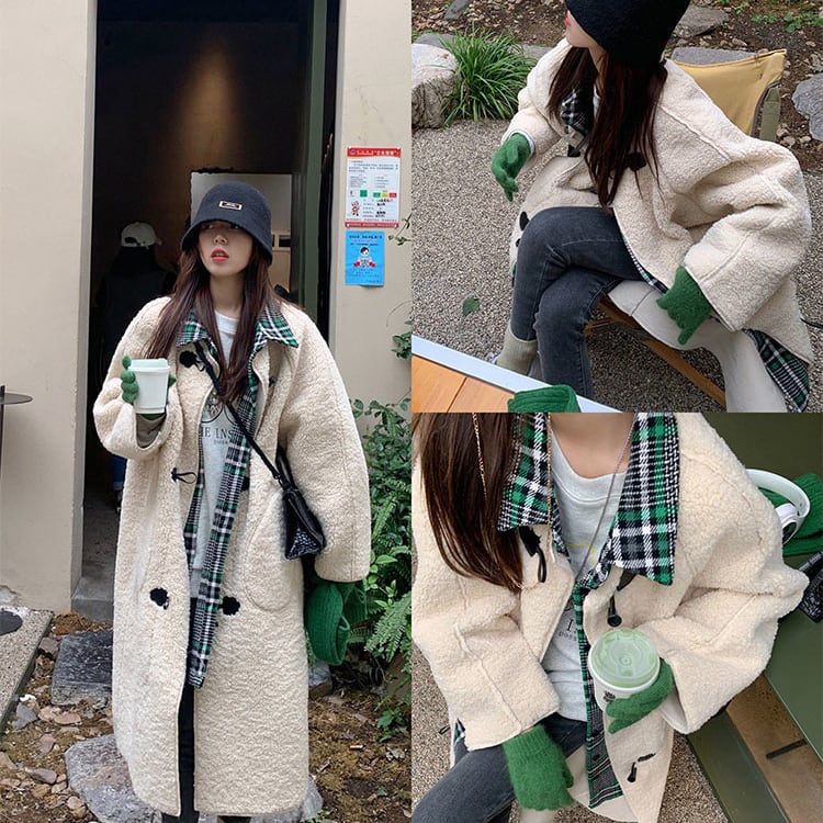 ダッフルコート ミディアム丈 フェイクツーピース 重ね着風 襟 チェック 暖かい 防寒 秋冬 ボア ゆったり カジュアル 普段着 お出かけ OU-029YK