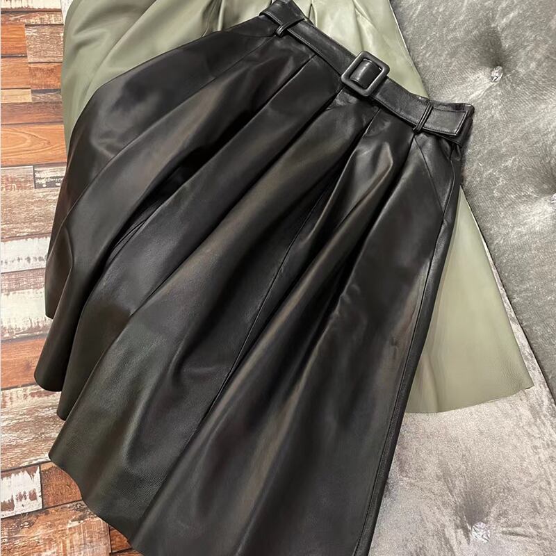 【送料無料】レザースカート ミドル丈 膝下 ロング ベルト Aライン ハイウエスト シープレザー フェミニン きれいめ エレガント 上品 大人可愛い カジュアル シンプル ベーシック お出かけ デート 普段使い デイリー SK-015RT
