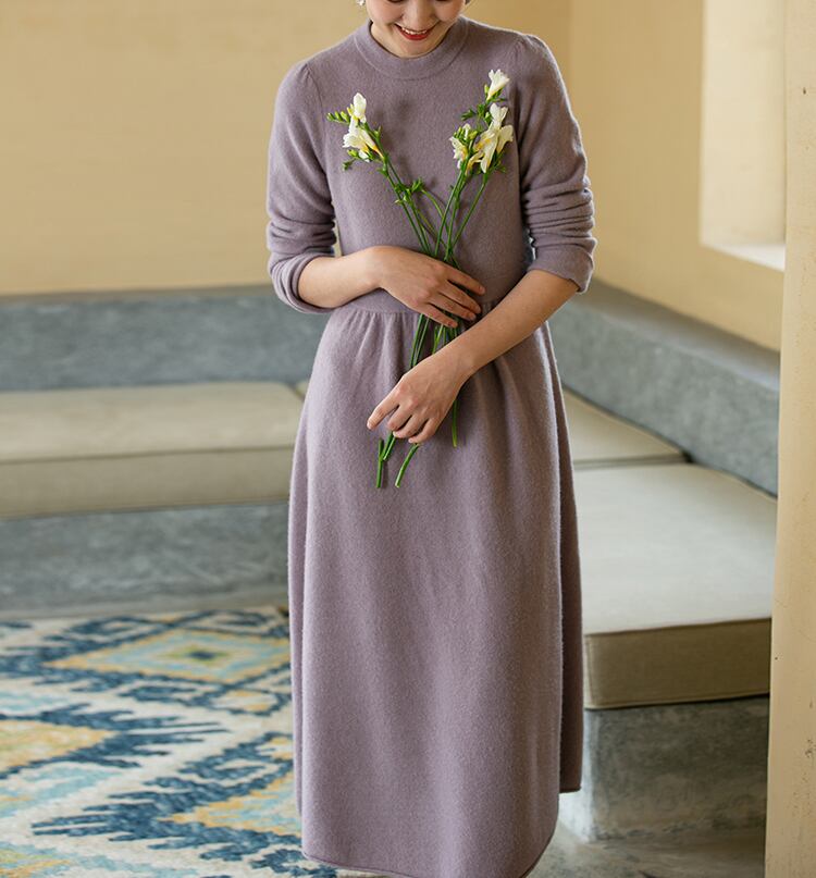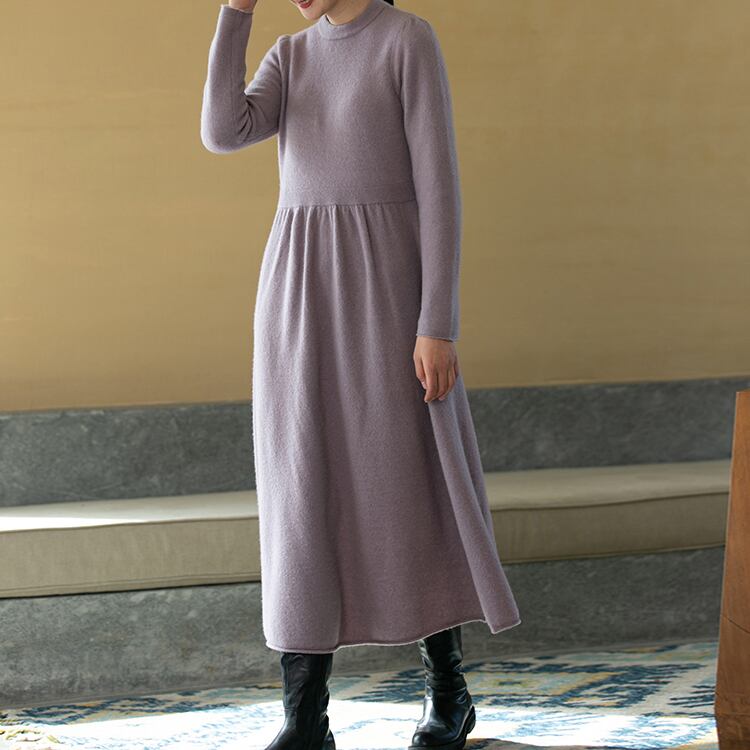 ワンピース ロング丈 クルーネック 長袖 無地 ハイウエスト Aライン フレア ウール混 シンプル フェミニン 上品 お出かけ 普段着 OP-009YK