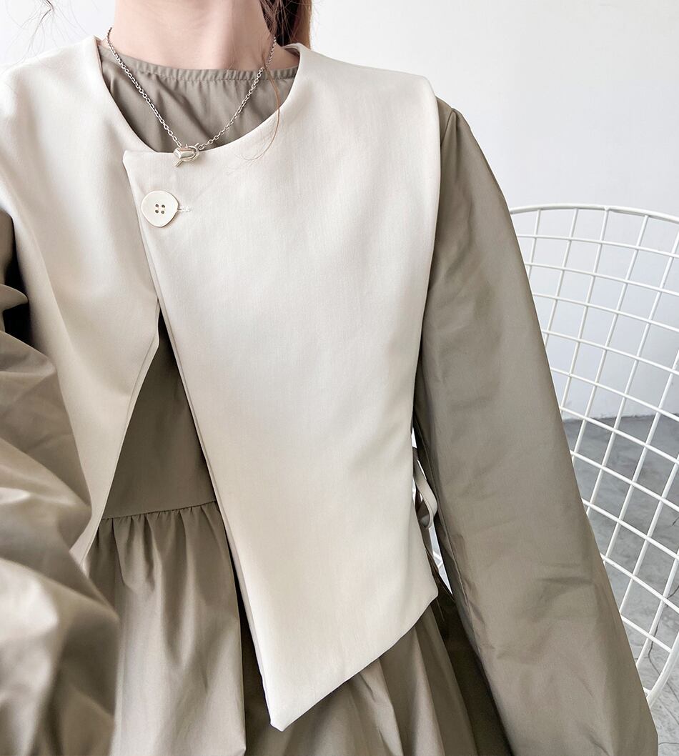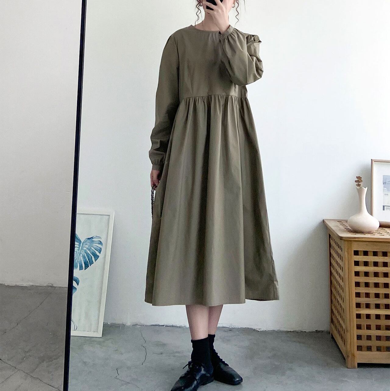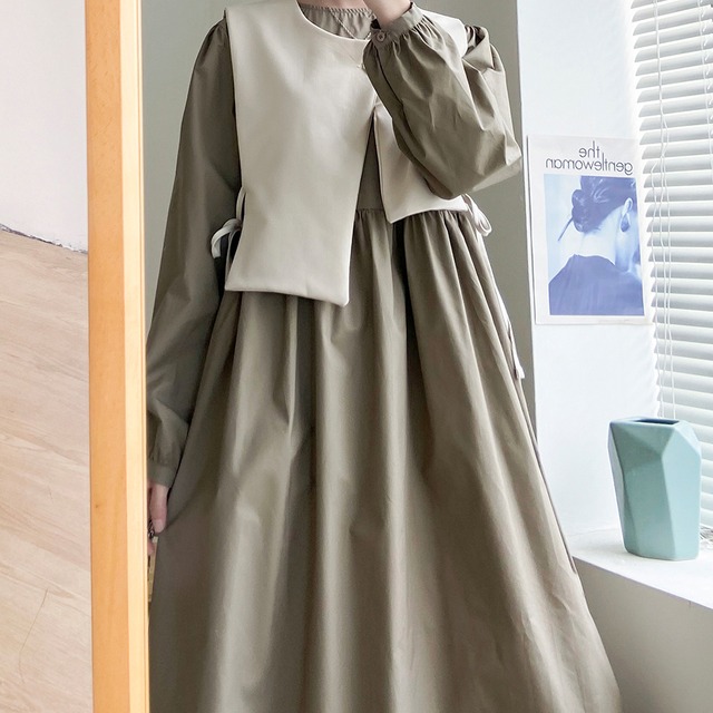 ワンピース ベスト チョッキ 2点セット ツーピース ラウンドネック 長袖 フレア ミディアム丈 ゆったり ナチュラル リラックス カジュアル 普段着 お出かけ ST-008YK