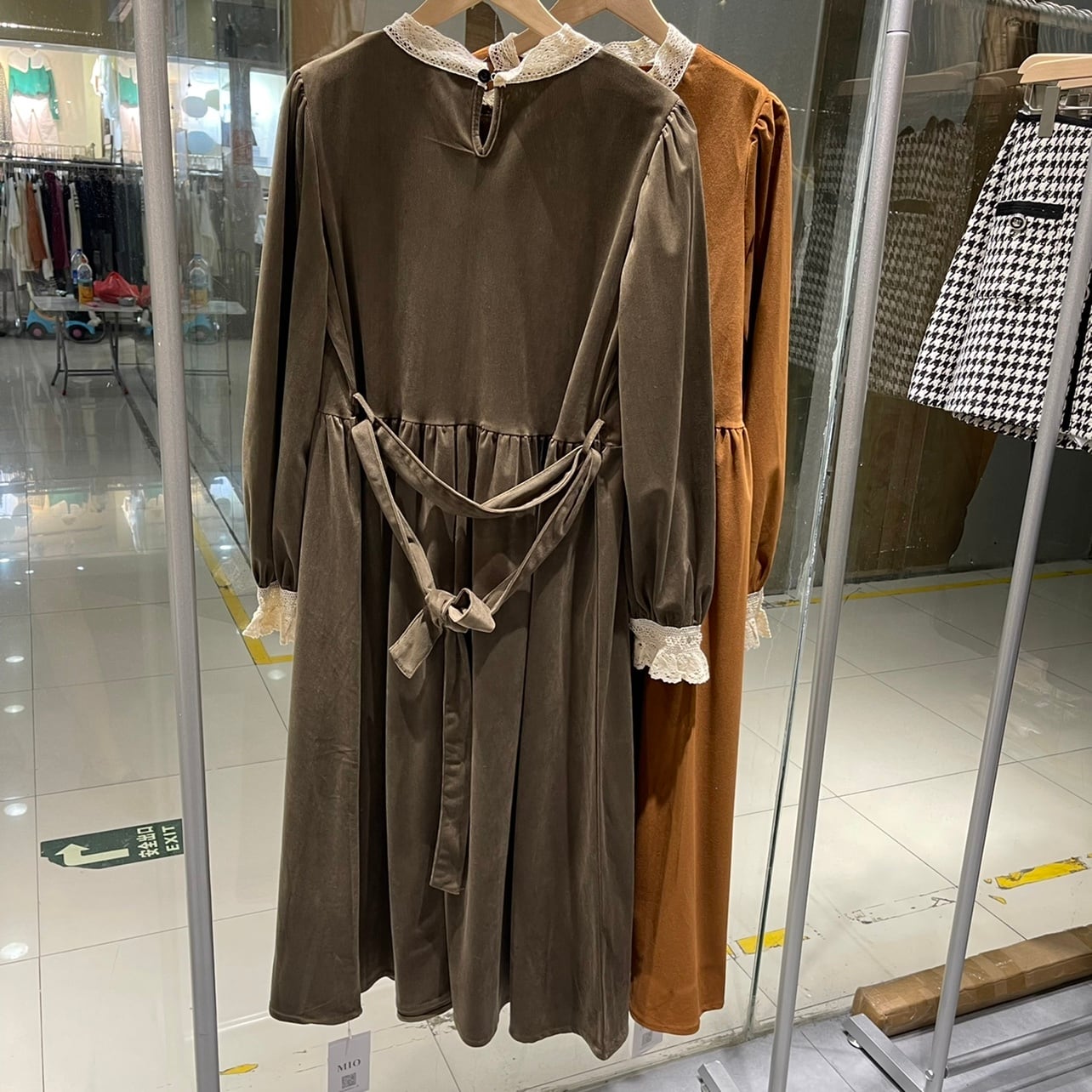 ワンピース ロング丈 長袖 ラウンドネック Aライン ハイウエスト オリーブグリーン レース ベルト 無地 シンプル コーデュロイ ゆったり ルーズ フェミニン エレガント 大人カジュアル 秋冬 普段着 通勤 お出かけ OP-011YK