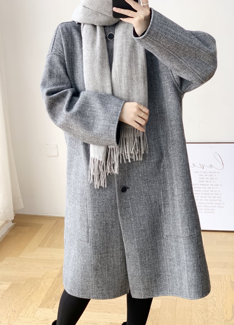 ノーカラーコート アウター レディース ミディアム丈 Aライン ヘリンボーン 厚手 秋冬 カジュアル エレガント 通勤 お出かけ 普段着 OU-074YK
