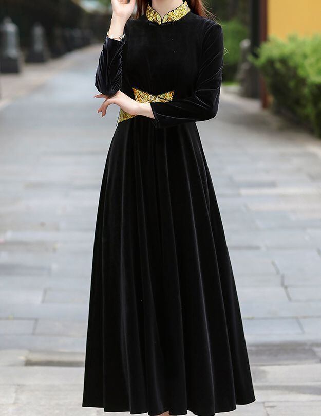 ワンピース チャイナドレス ロング丈 マオカラー 長袖 ハイウエスト フレア エレガント ゴージャス 上品 お出かけ デート パーティー フォーマル OP-017YK