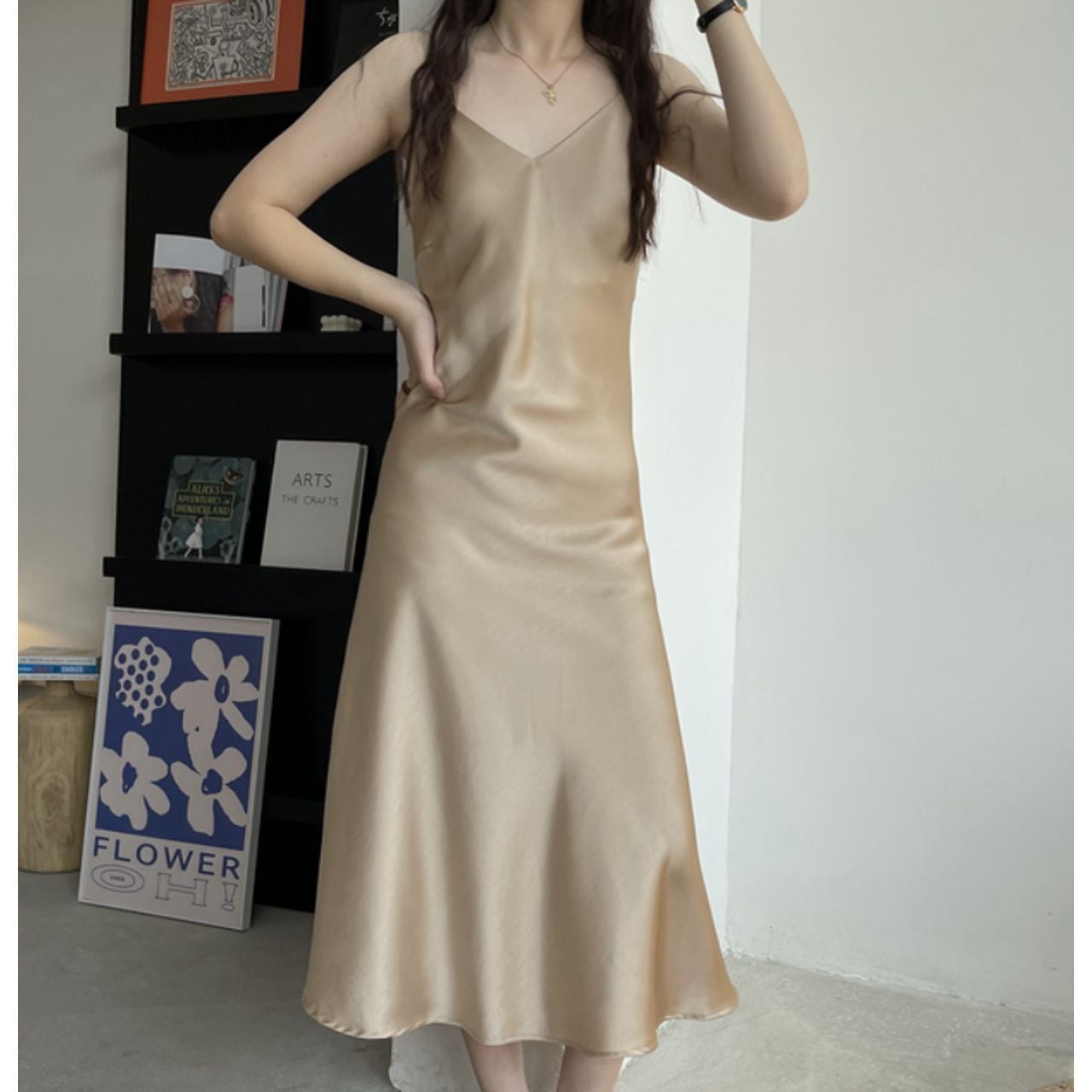 スカートは広がり過ぎないセミフレアシルエットですっきりと。