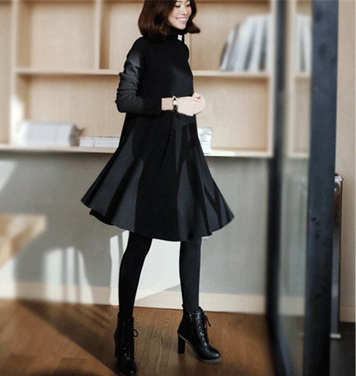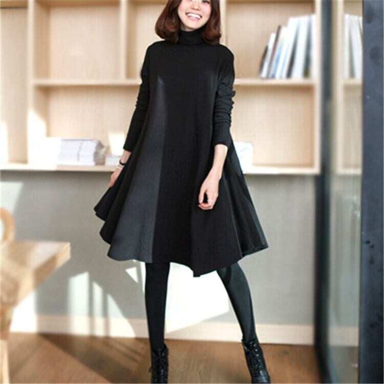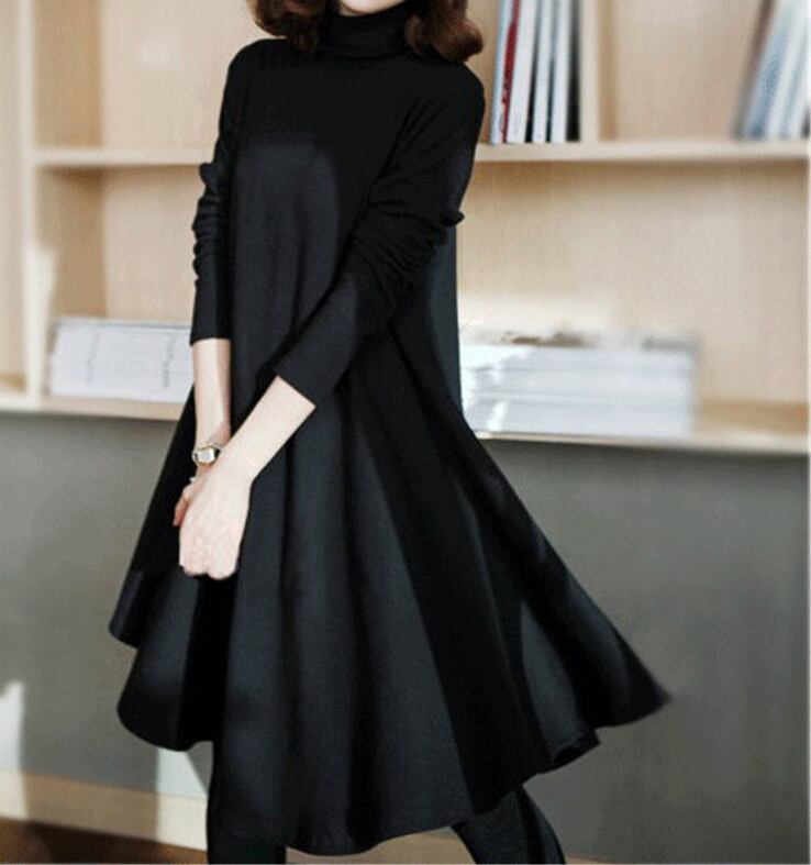 ワンピース レディース タートルネック 長袖 ミディアム丈 Aライン 体型カバー ゆったり フレア 無地 上品 お出かけ デート 通勤 普段着 秋冬 OP-027YK