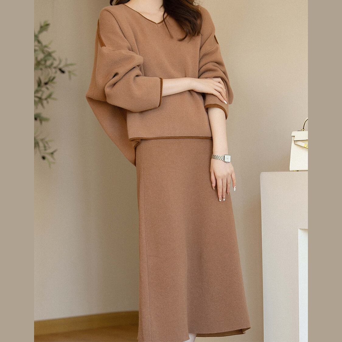 セットアップ ツーピース 上下セット 長袖 スカート Vネック ドルマンスリーブ ドロップショルダー Aライン 無地 シンプル ミモレ丈 上品 エレガント 通勤 お出かけ おしゃれ ST-009YK