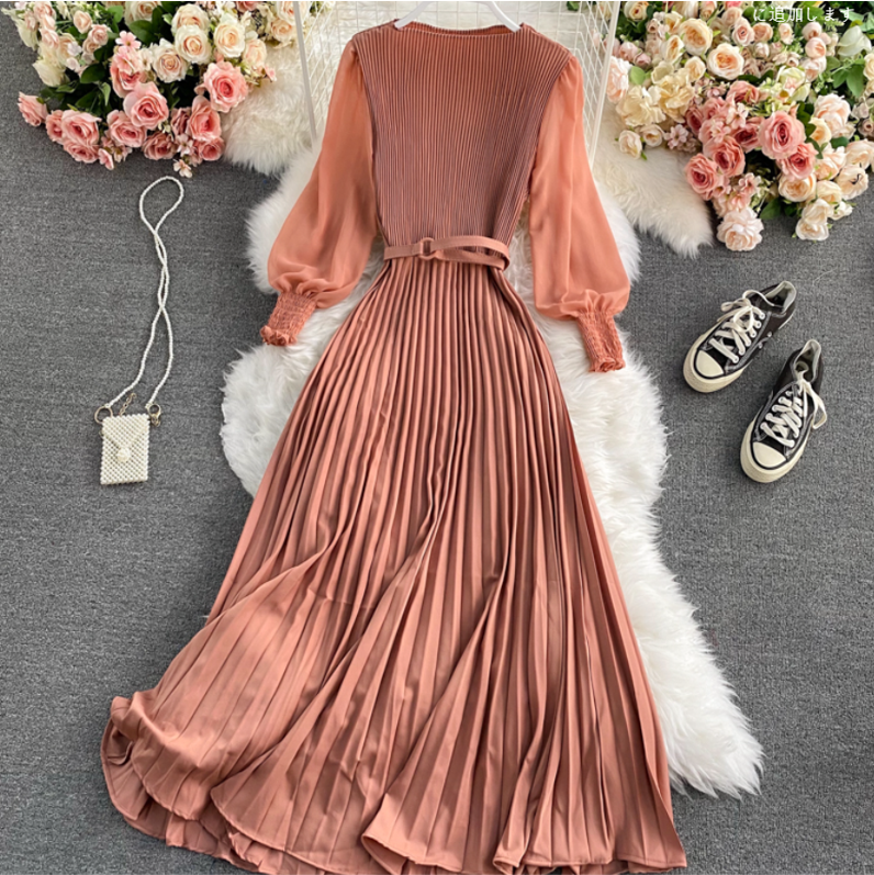 ワンピース レディース プリーツ 長袖 ロング丈 シフォン プリーツスカートハイウエスト ベルト OP-003MS