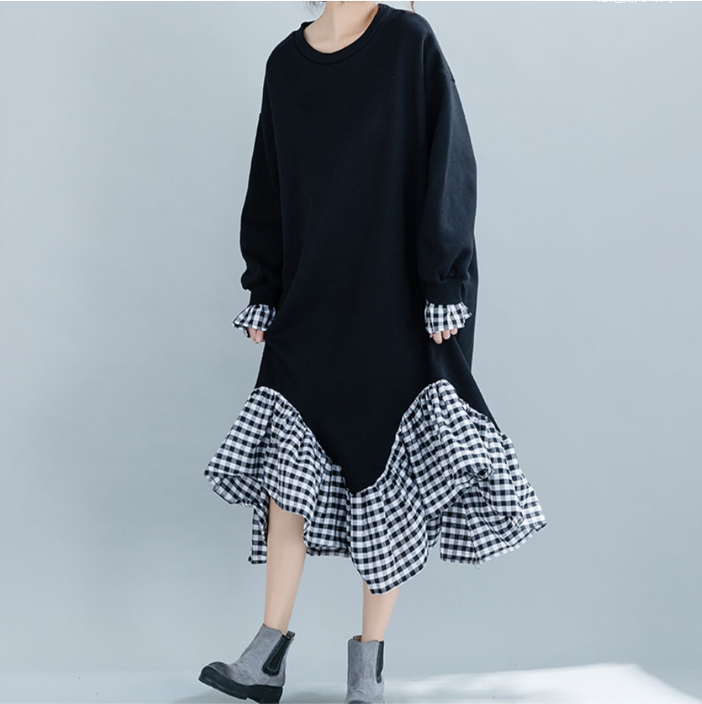 ワンピース レディース 長袖 ミモレ丈 Aライン チェック 大きいサイズ ゆったり フリル カジュアル 秋冬 お出かけ デート 普段着 OP-005MS