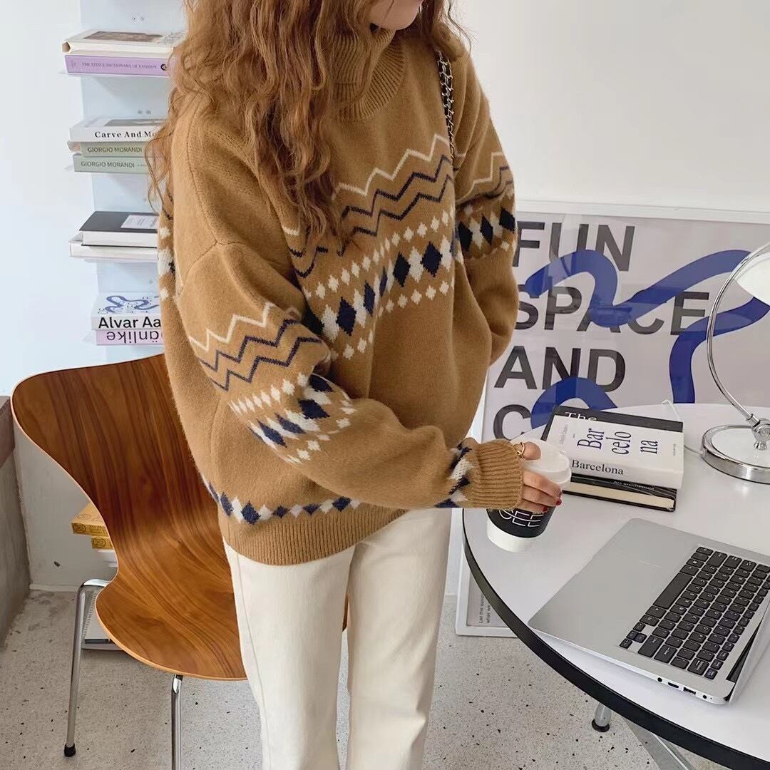 ニット ハイネックトップス アーガイル カジュアル 秋 冬 おしゃれ ノルディック 長袖 厚手 お出かけ TP-003GT