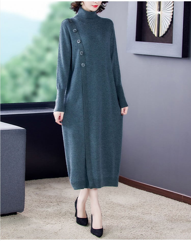 ワンピース ニットワンピ ハイネック ロングワンピ ボタン 上品 無地 シンプル 長袖 秋冬 お出かけ デート OP-008GT