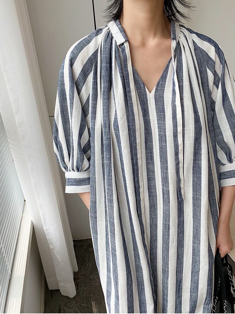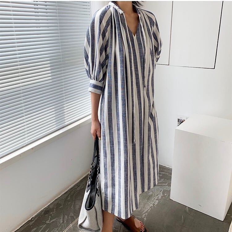 ワンピース ロングワンピ リネンワンピ Vネック ストライプ パフスリーブ 上品 カジュアル シンプル 長袖 春 夏 お出かけ デート OP-011GT