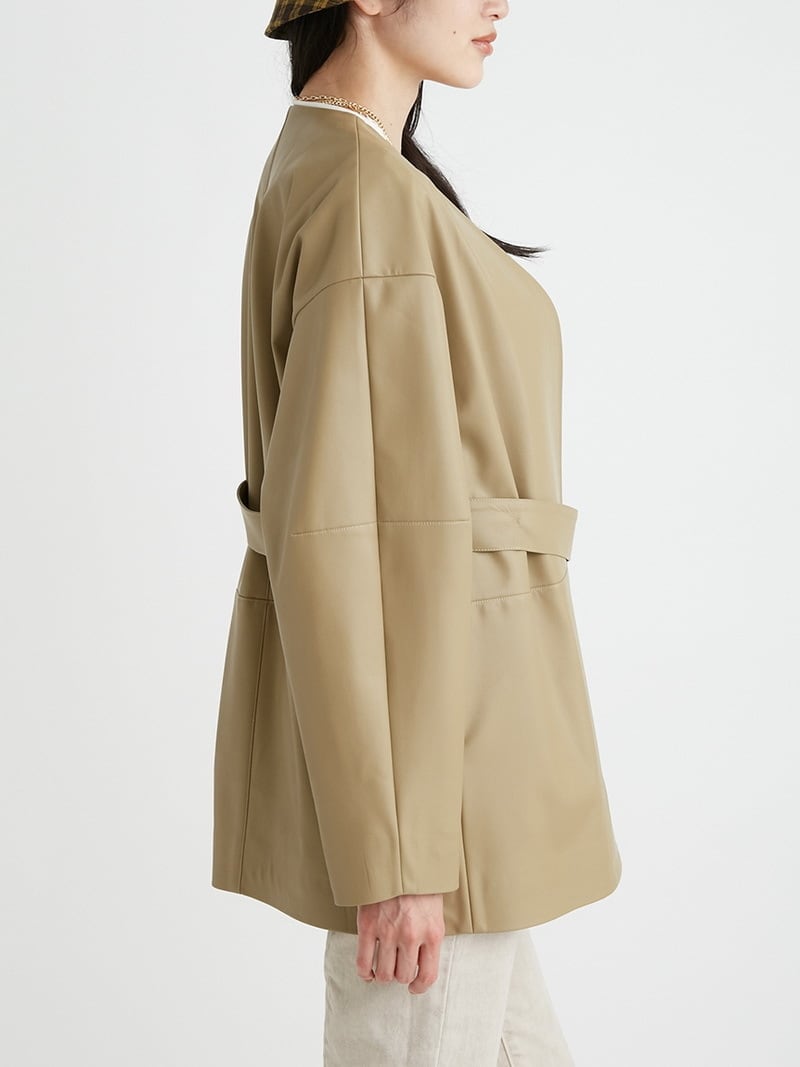 フェイクレザージャケット アウター レディース 長袖 Vネック ベルトリボン ショート丈 無地 シンプル カジュアル 上品 通勤 普段着 おしゃれ OU-134YK