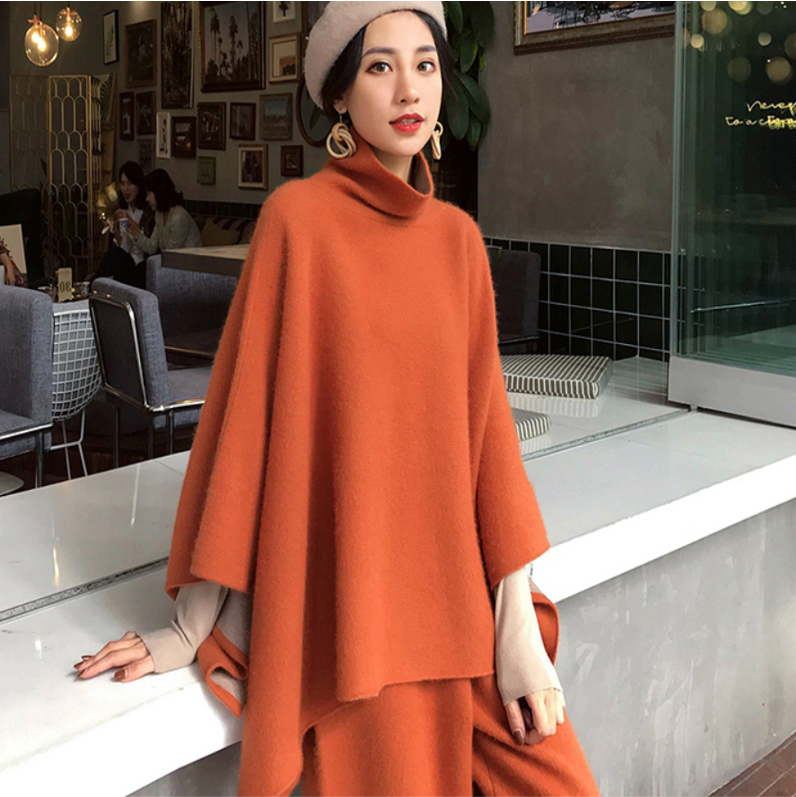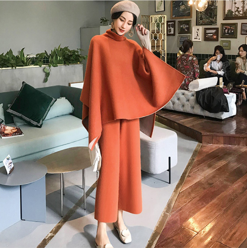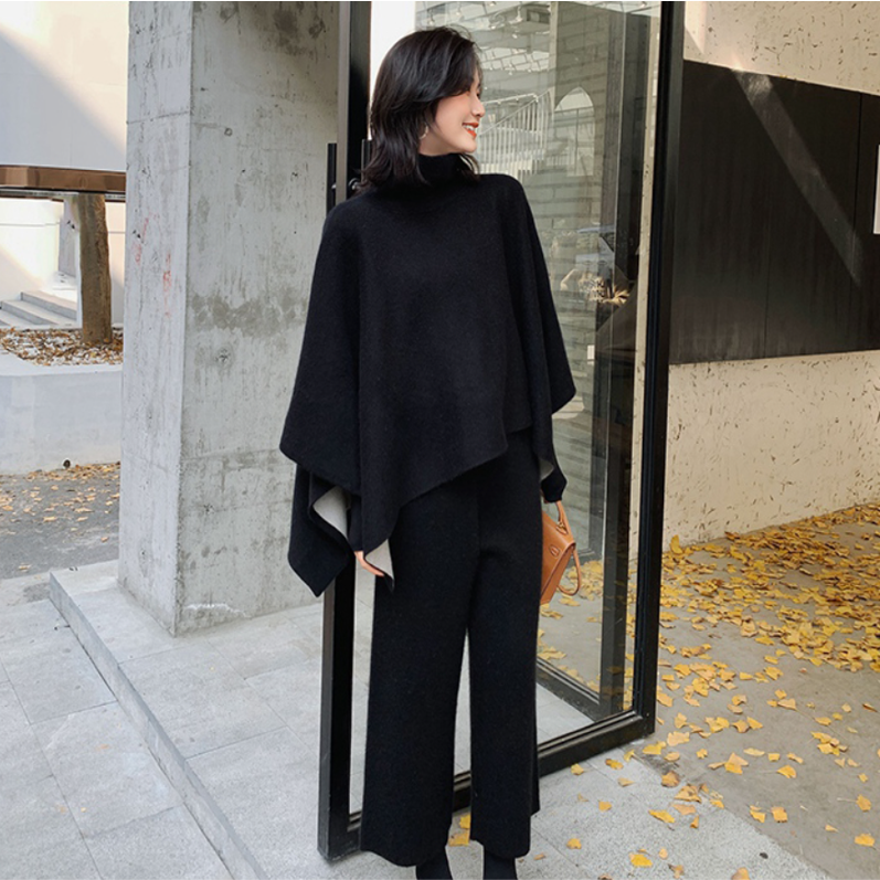 シンプルなハイネックのマントコートとワイドパンツ付きのお得セット!
