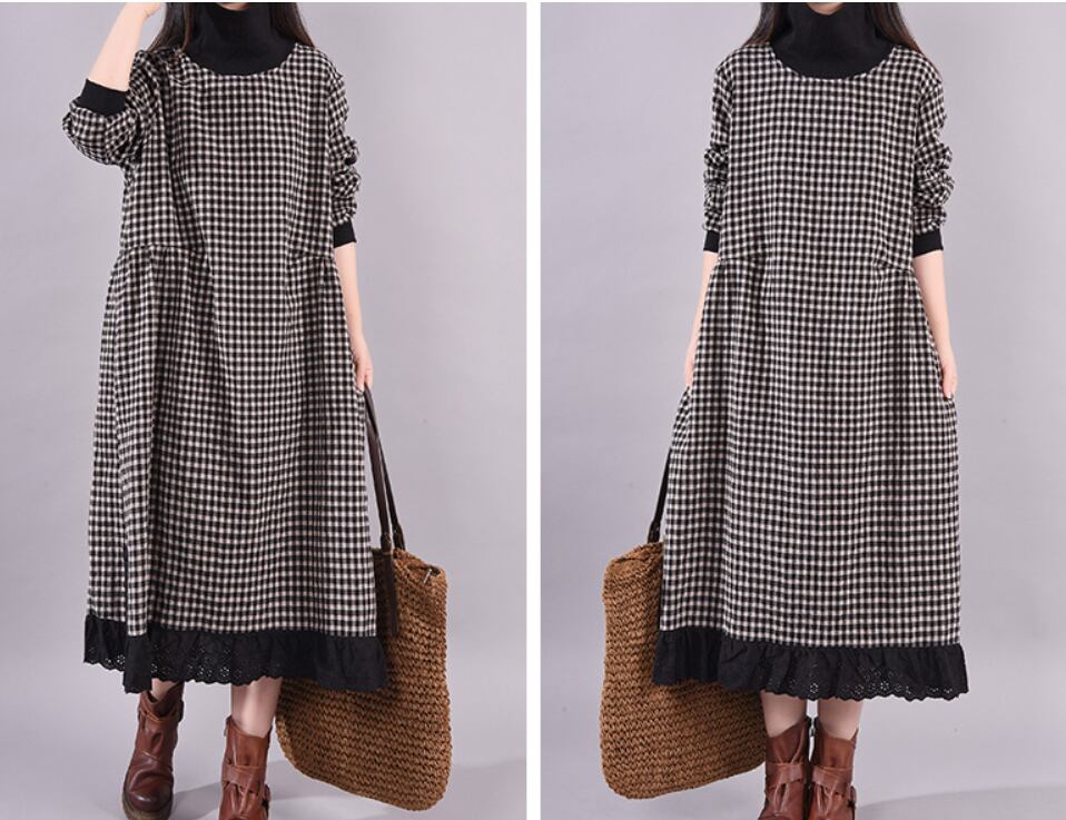 黒 チェック ワンピース ギンガム チェック ギンガムチェック リネン ワンピース 長袖 コットン レディース 秋冬 きれいめ aライン 長袖 大人 上品 カジュアル フレア ミモレ丈 ミディアム丈 フレアワンピース 上品 おしゃれ シンプル 長袖 秋冬 通勤 オケージョン お出かけ デート 可愛い 大人 OP-031MS