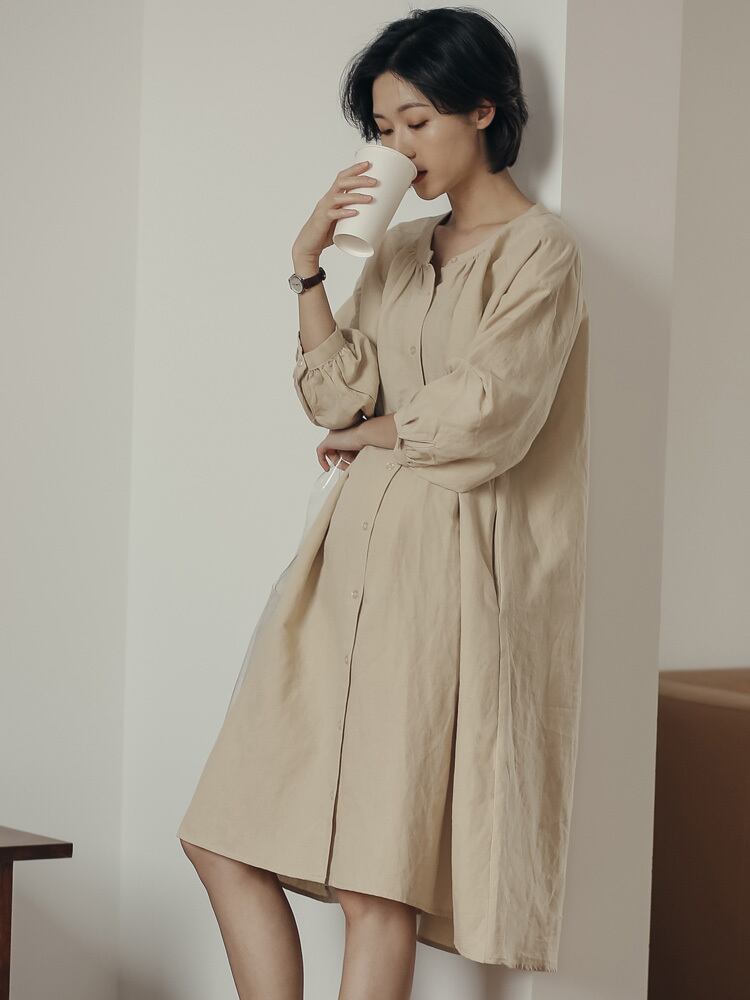 シャツワンピース リネンライク 7分袖 ミドル丈フロントボタンワンピース 麻 春夏 おしゃれ シンプル 無地 大きいサイズ シルエット 上品 カジュアル ラウンドネック OP-033SE