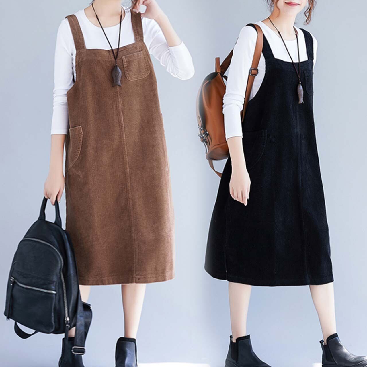 ジャンバースカート オールインワン コーデュロイ おおきめサイズ ひざ下丈 秋冬 かわいい アクティブ ブラック ブラウン AI-001KA