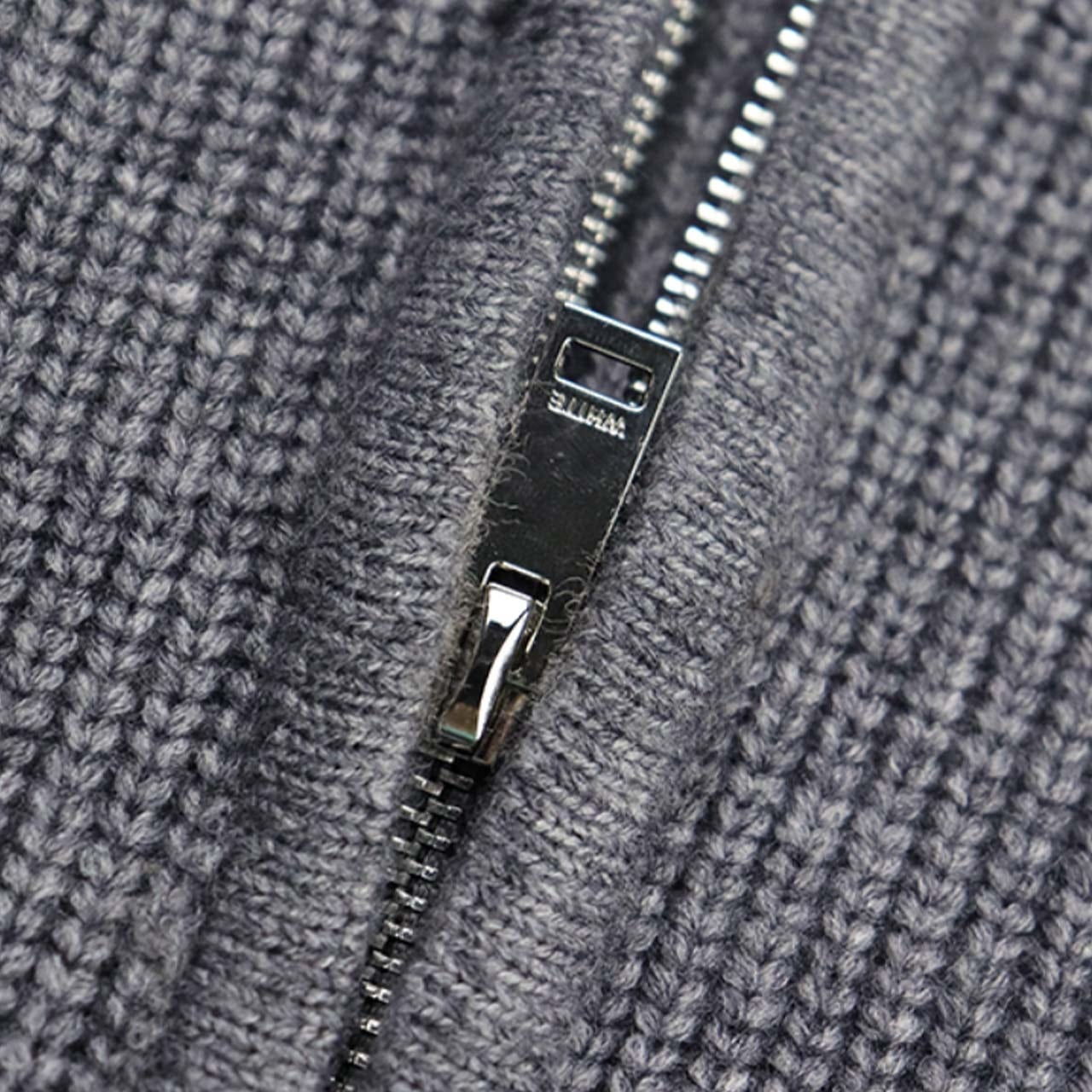 グレーのタートルネックカーディガンです。ジッパー仕様で脱ぎ着も楽々。