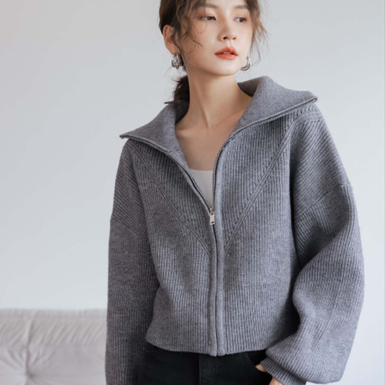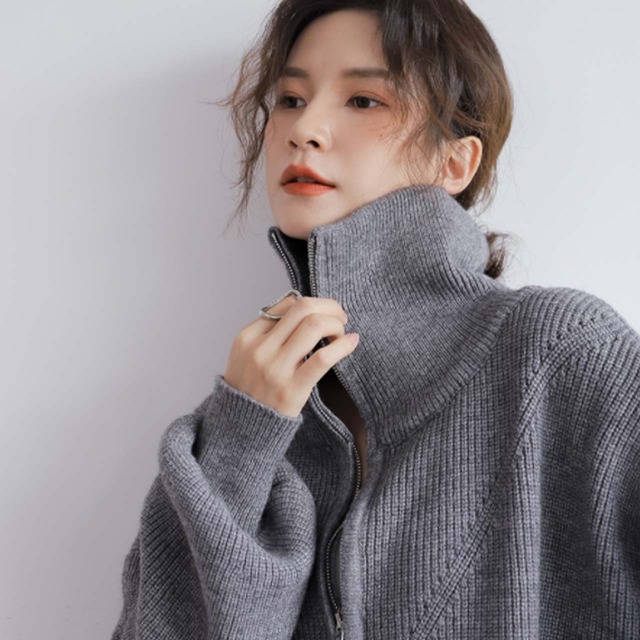 タートルネックカーディガン グレー 無地 ジッパー ゆったり 秋冬 カジュアル おしゃれ かわいい きれいめ 羽織る リブ TP-001KA