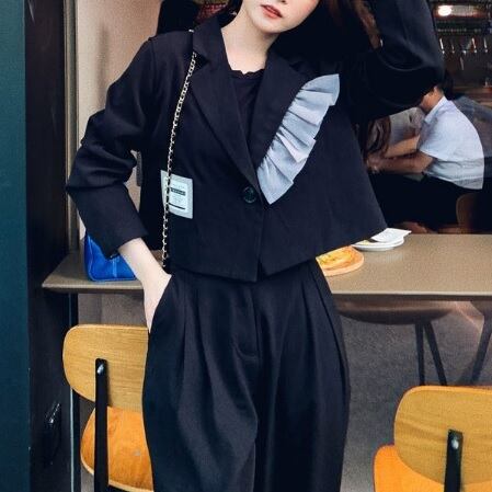 セットアップ ツーピース 2点セット 上下 春秋 バイカラー パンツスーツ ロングパンツ ワイドレッグパンツ レディース フリル テーラード ジャケット ロングパンツ シンプル きれいめ レトロ タウン お出かけ セレモニー ST-011CA