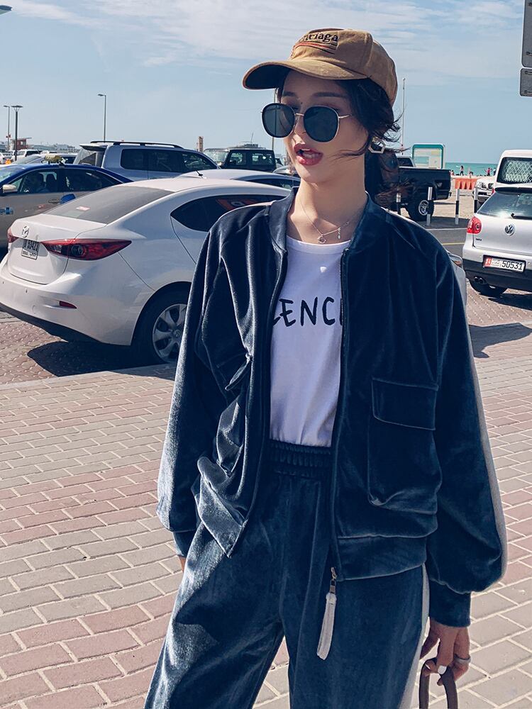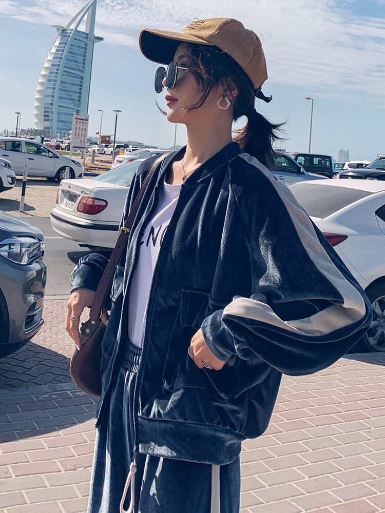着心地良いベロア調の大人カジュアルなセットアップ。デイリーユースはもちろん、ルームウェアとしても。