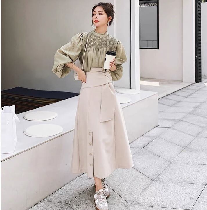 セットアップ ツーピース 2点セット 上下 春夏 ブラウス シャツ シャーリング ランタンスリーブ ボリューム袖 ふんわり 長袖 スカート ロング レギュラーヘム ベルト ワントーン 無地 シンプル きれいめ フェミニン タウン お出かけ デート ST-013CA