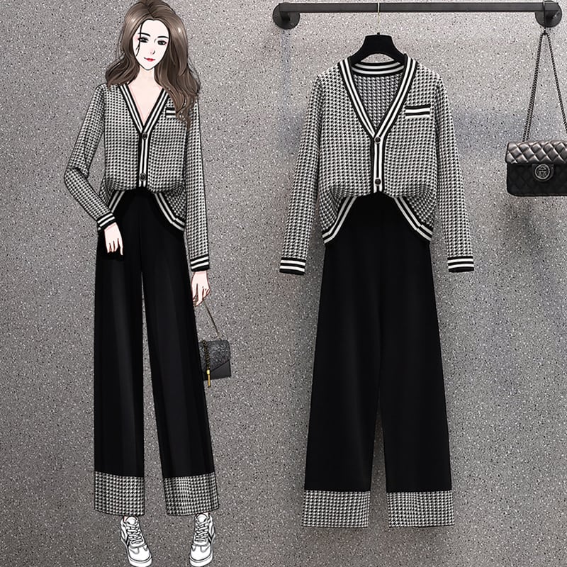 セットアップ ツーピース 2点セット ニット 長袖 Vネック カーディガン 千鳥格子 モノトーン ロングパンツ ハイウエスト ウエストゴム 伸縮性 ワイドレッグ 着回し レディース サイズ豊富 大きめサイズ おしゃれ シンプル カジュアル レトロ きれいめ タウン お出かけ デート ST-033CA