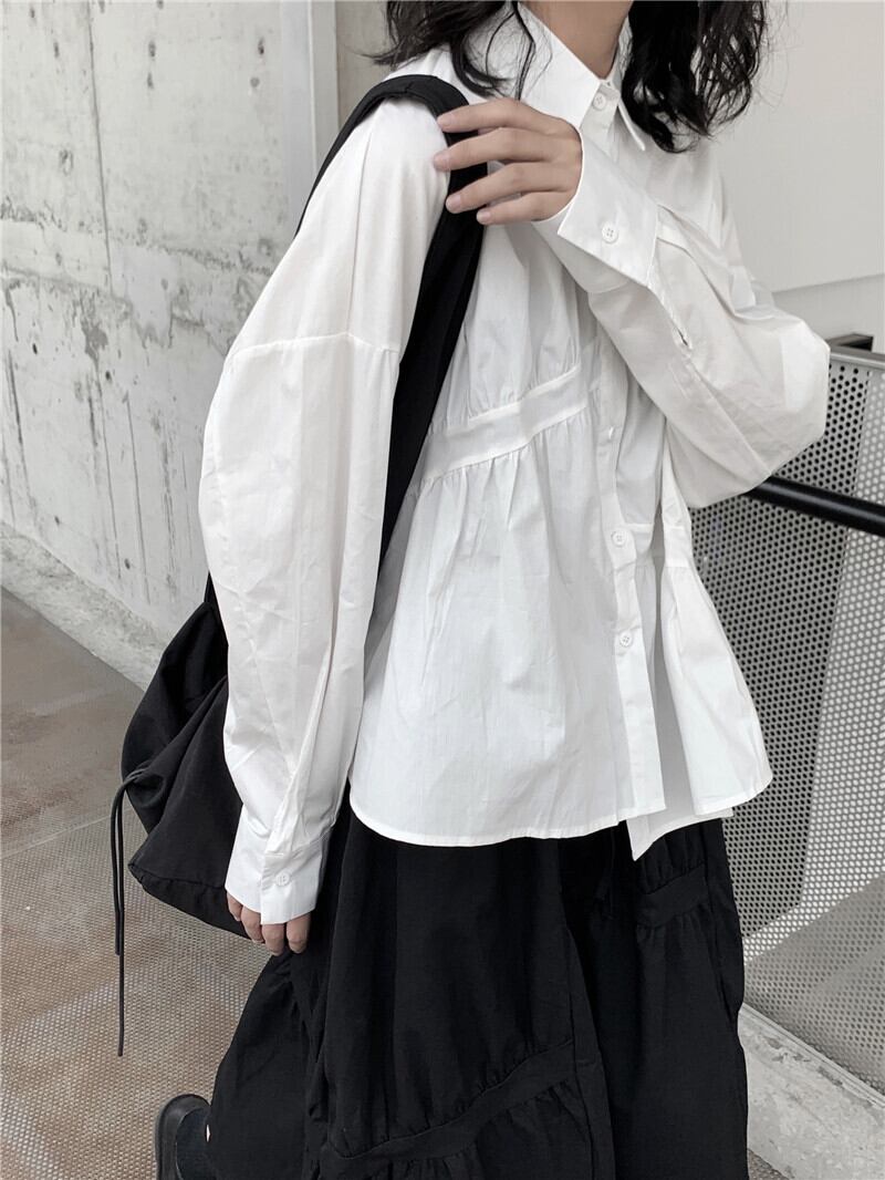アシンメトリーブラウス トップス ブラウス シャツ 非対称 ポロカラー 長袖 ワントーン 無地 ゆったり ルーズ フロントボタン レディース 春秋 おしゃれ トレンド シンプル モード レトロ ノスタルジック デイリー タウン お出かけ デート TP-042CA