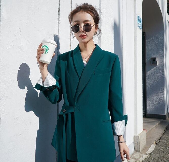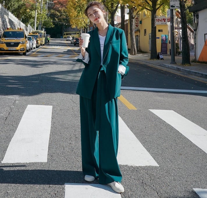 使いやすいジャケットとロングパンツのきれいめパンツスーツ。