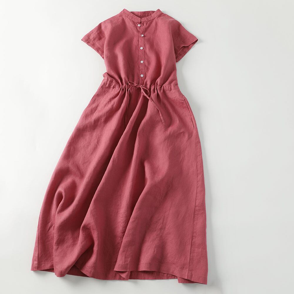 リネンワンピース ワンピース 麻 スタンド襟 ウエストリボン 半袖 軽やか ロング 夏 ワントーン 無地 レディース シンプル カジュアル レトロ ナチュラル カントリー デイリー タウン お出かけ デート OP-051CA