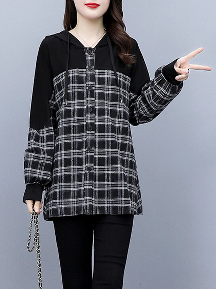 チェックシャツ レディース ゆったり シャツ 長袖 フード付き パーカー カジュアル ボタン おしゃれ ギンガムチェックシャツ 韓国 アウターストリート レジャー アウトドア お出かけ 秋冬 TP-034SE