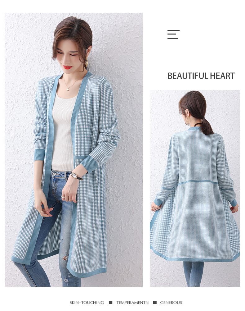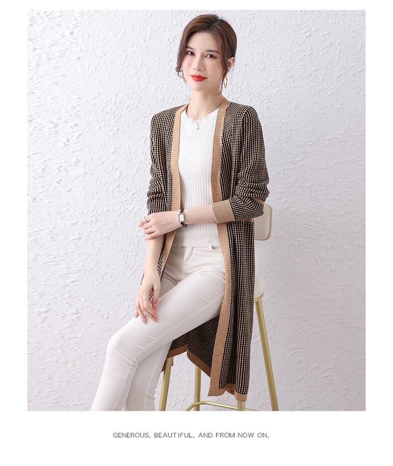 ロングニットカーディガン カーディガン カーデ 長袖 ロング丈 柄 チェック柄 配色 Vネック ウール混 羽織り ゆったり 春秋 着回し 体型カバー 大きめサイズ 大きいサイズ レディース シンプル きれいめ エレガント ノスタルジック レトロ デイリー タウン お出かけ デート TP-064CA