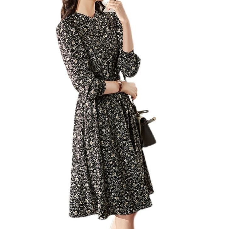 フローラルワンピース ワンピース ワンピ 小花柄 長袖 ミディ丈 ひざ下 膝下 ラウンドネック 花柄 フラワー フローラル プリント ハイウエスト Aライン 軽やか 春秋 レディース シンプル フェミニン きれいめ シック エレガント レトロ ノスタルジック タウン お出かけ デート OP-080CA