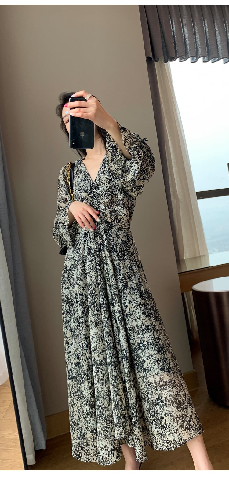長めの着丈ながらVネックですっきり見えが叶う花柄ワンピース。