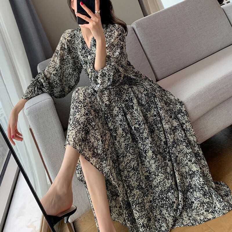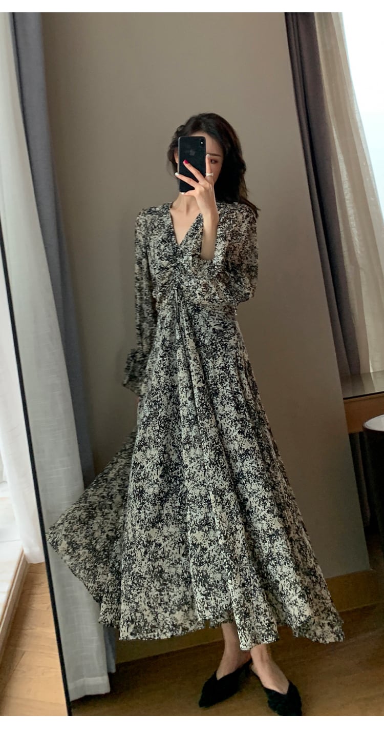 花柄シフォンワンピース ワンピース ワンピ 長袖 ロング丈 シャーリング Vネック Vカット 花柄 フラワー フローラル ボタニカル プリント ハイウエスト Aライン フレアスリーブ キャンディスリーブ 大きめサイズ 大きいサイズ サイズ豊富 軽やか 春秋 レディース シンプル エレガント フェミニン きれいめ シック レトロ ノスタルジック タウン お出かけ デート OP-082CA