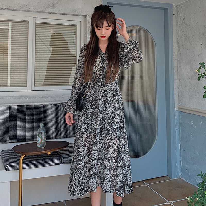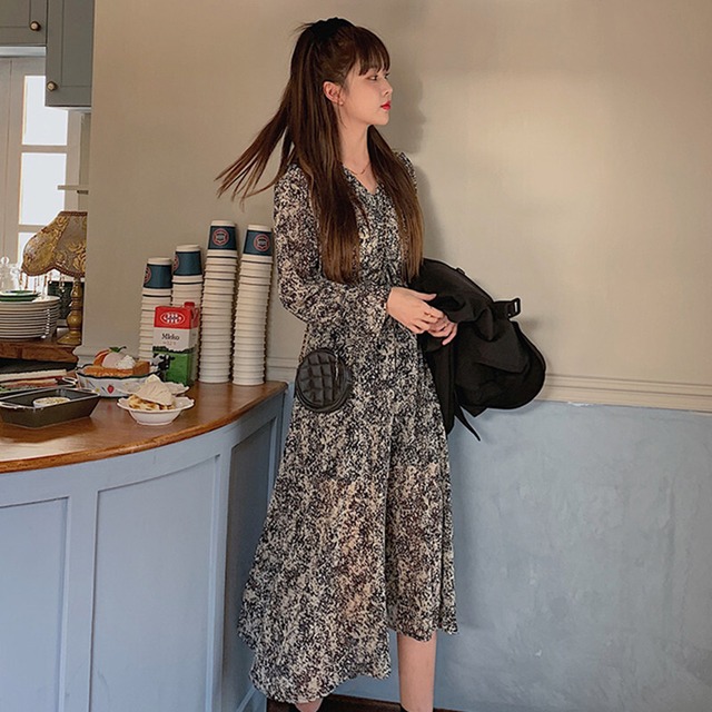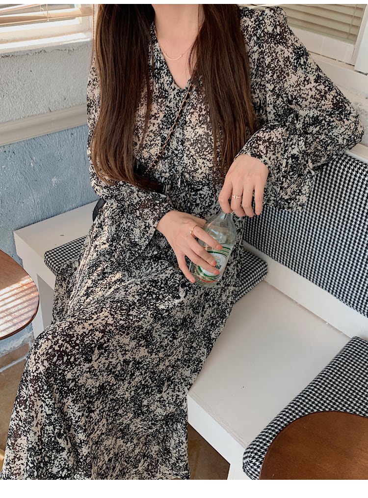 ロング丈で重くなりがちな印象もフレアシルエットとVネックで軽やかに仕上げたfloralワンピース。足元はローファーなどを合わせるのが今年らしくておすすめです。
