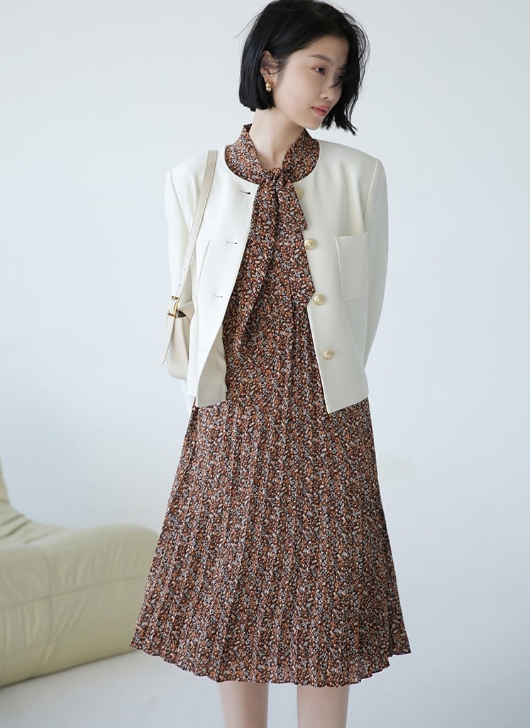 フローラルプリーツワンピース ワンピース ワンピ Aライン フレア ボウタイ リボン 長袖 ミディ丈 ひざ下 膝下 花柄 フラワー フローラル ボタニカル プリント 春秋 ハイウエスト レディース クラシカル フェミニン 大人可愛い エレガント レトロ シンプル ノスタルジック タウン お出かけ デート お呼ばれ OP-107CA