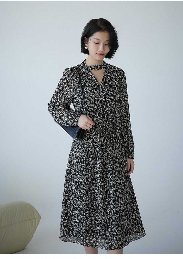 フローラルVネックワンピース ワンピース ワンピ Aライン フレア ボウタイ チョーカー風 シフォン 裏地付き 長袖 ミディ丈 ひざ下 膝下 花柄 フラワー フローラル ボタニカル プリント 春秋 ハイウエスト レディース クラシカル フェミニン 大人可愛い エレガント レトロ シンプル ノスタルジック タウン お出かけ デート お呼ばれ OP-108CA