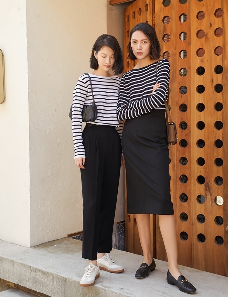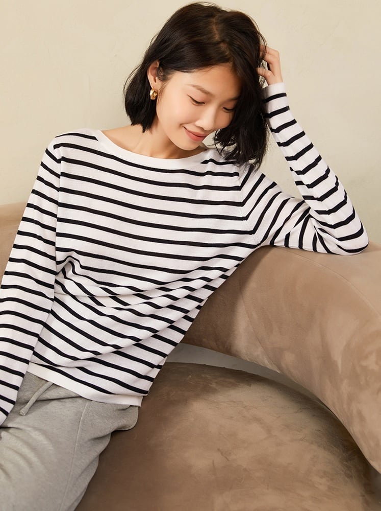 柔らかで快適な着心地のウールニットトップス。使いやすいバイカラーのボーダーストライプデザイン。ジャケットなどのアウターに合わせても着ぶくれしにくいのもポイント。