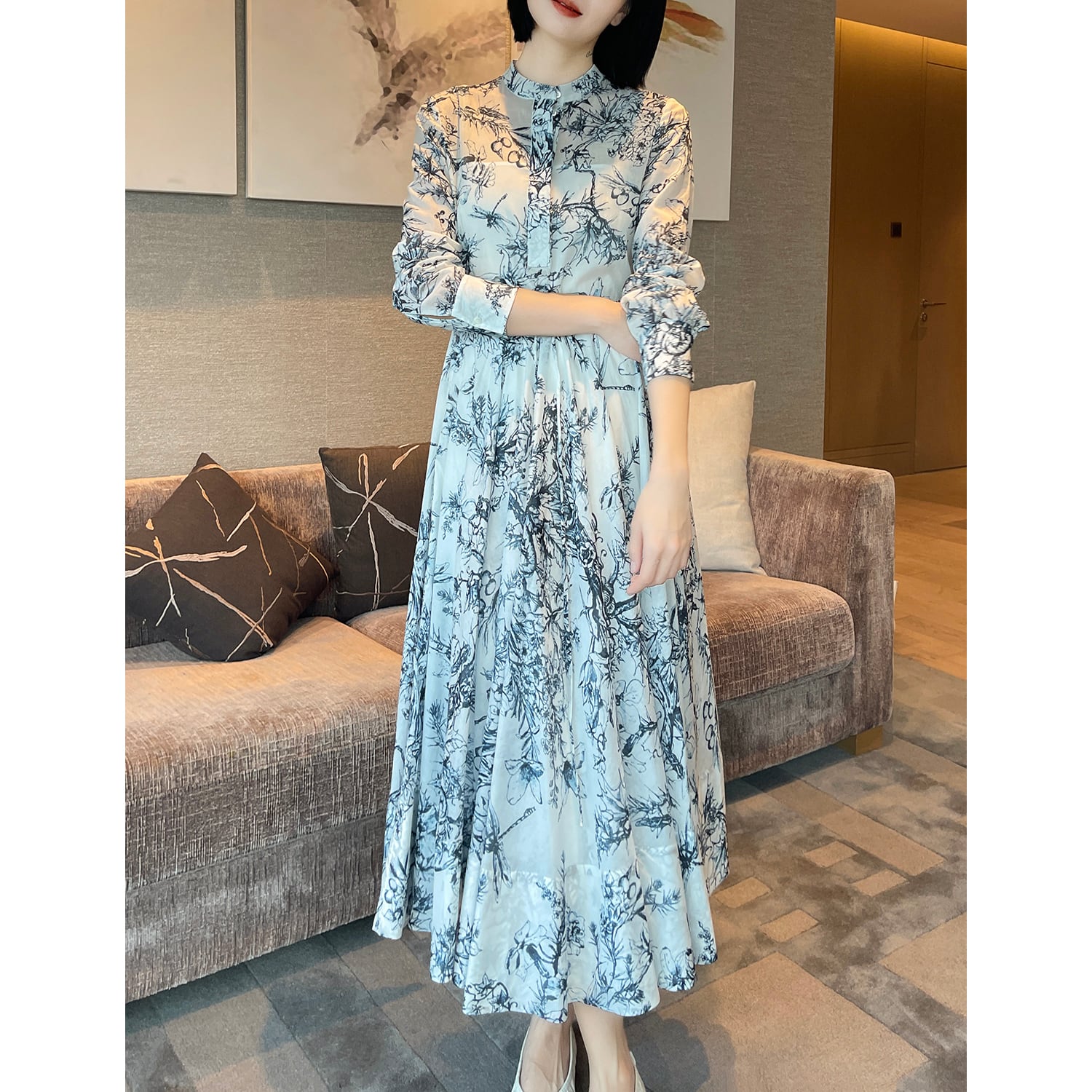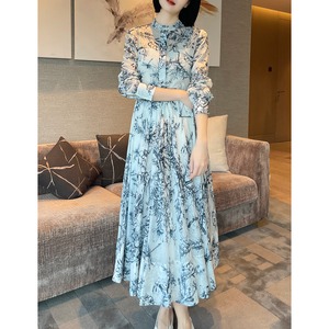 重くなりがちなロング丈もモダンな花柄とフレアシルエットぱっと華やぐ一枚です。