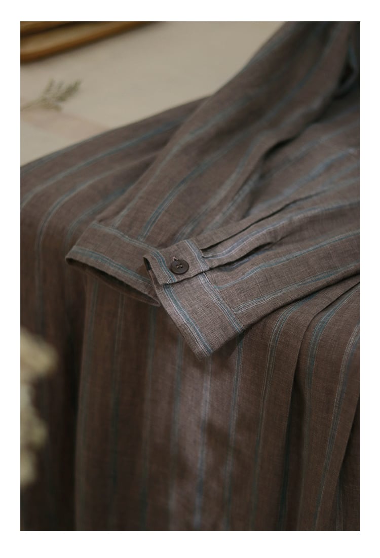 リネン染めストライプワンピース ワンピース シャツワンピース 麻 リネン ストライプ 滑らか ウエストリボン Aライン ロング丈 スタンドカラー フロントボタン 前ボタン ハーフボタン ポケット付き 長袖 ミドルウエスト 軽やか 春秋 レディース シンプル 上品 エレガント レトロ ノスタルジック きれいめ シック デイリー タウン お出かけ デート OP-144CA