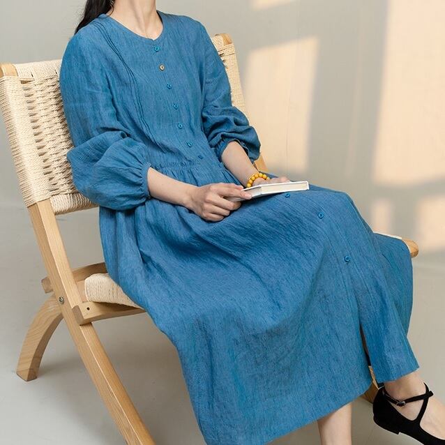 リネンワンピース ワンピース 麻 リネン Aライン ロング丈 ふんわり ラウンドネック フロントボタン 前ボタン カラフルボタン ポケット付き 長袖 ルーズウエスト 軽やか 春秋 レディース シンプル カジュアル ナチュラル カントリー レトロ ノスタルジック きれいめ シック デイリー タウン お出かけ デート OP-147CA