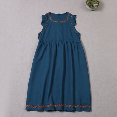 リネンワンピース ワンピース 麻 リネン Aライン ボタニカル フラワー 花 刺繍 フリル ノースリーブ ノースリ ロング丈 ルーズウエスト ポケット付き 軽やか 夏 レディース シンプル 森ガール ナチュラル レトロ ノスタルジック エスニック きれいめ シック デイリー タウン お出かけ デート OP-155CA