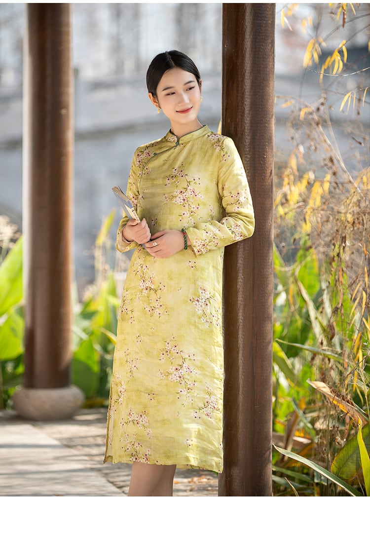 フローラルリネンワンピース ワンピース 麻 フローラル 花柄 ボタニカル Aライン ルーズウエスト 裏地付き 長袖 チャイナドレス風 軽やか ロング丈 春秋 レディース シンプル フェミニン エレガント きれいめ シック レトロ ノスタルジック タウン お出かけ お呼ばれ OP-156CA
