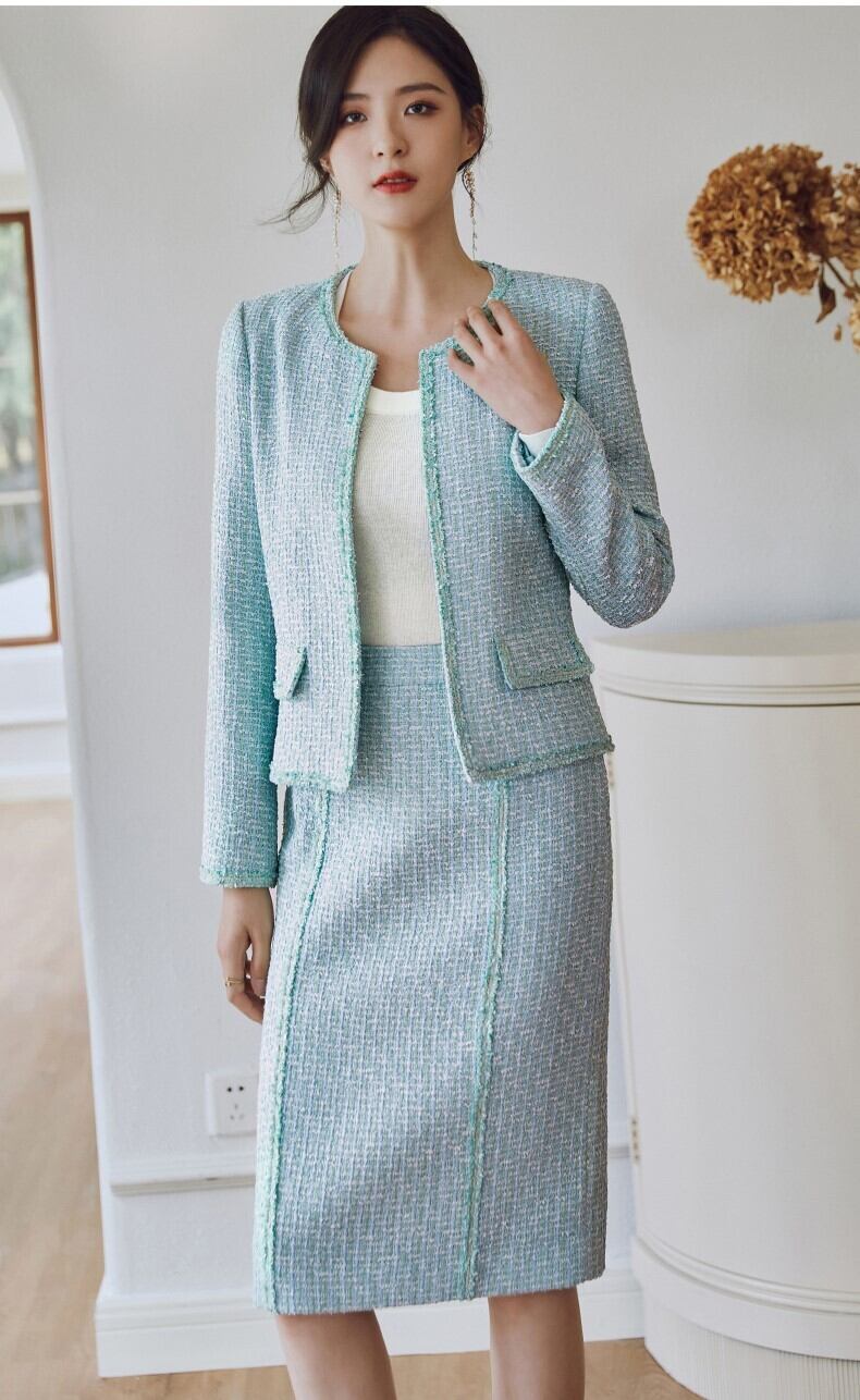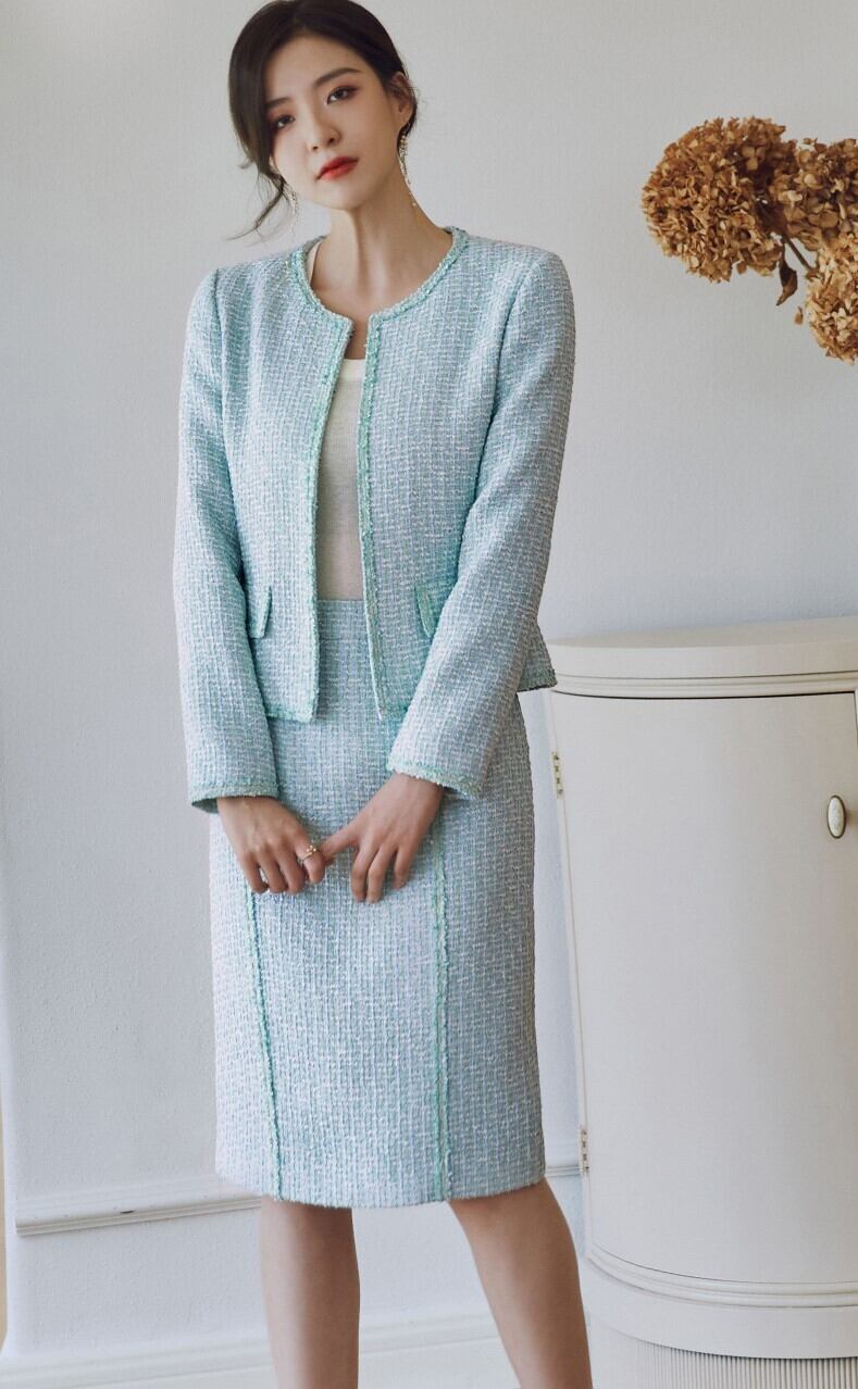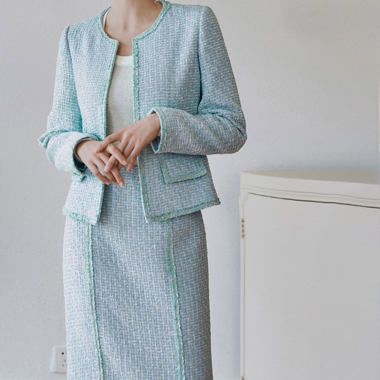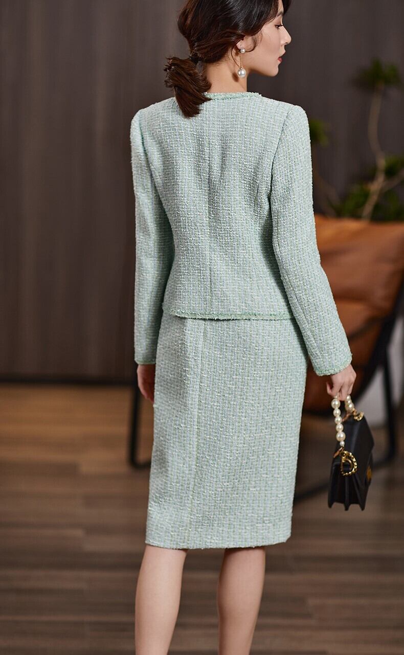 ツイード コート ジャケット スカート セットアップ スーツ ロング ミモレ丈 韓国 ファンシー ボタン 釦 金 グリーン 緑 ツイード 生地 丈長め ゴールド 大きいサイズ 春 冬 きれいめ シャネル コサージュ 毛糸 襟 セレモニー セットアップ 高身長 エレガント シック モード 通勤 デイリー タウン お出かけ デート ST-011KT
