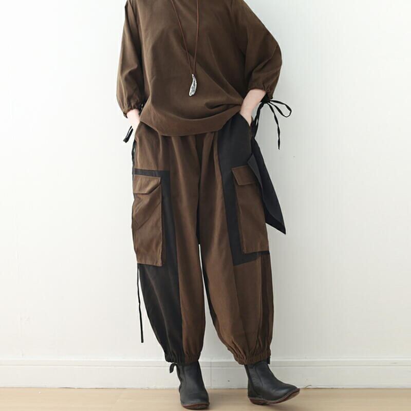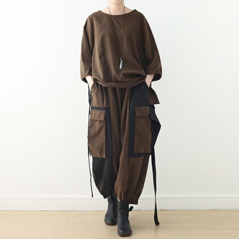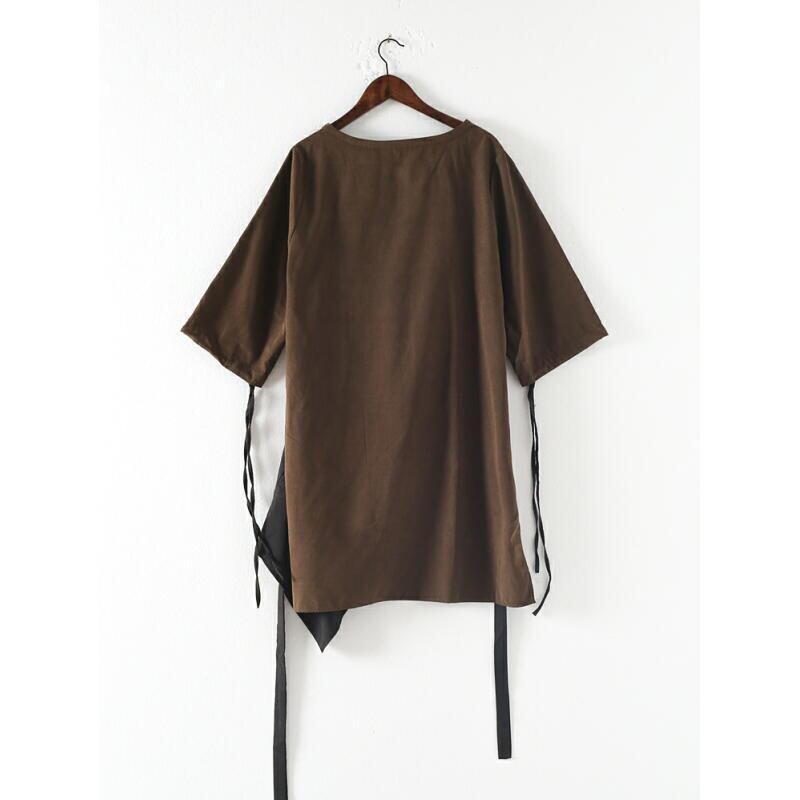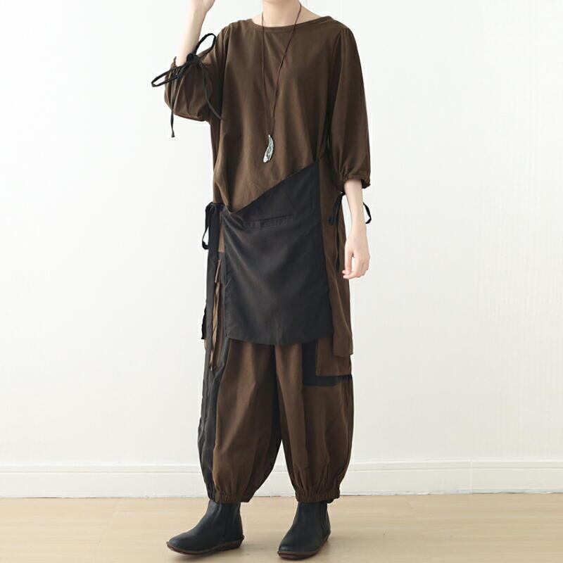 セットアップ 七分袖 ロングパンツ パッチワーク ツートン ブラック ブラウン 変形 個性的 春夏 お出かけ ST-007KM