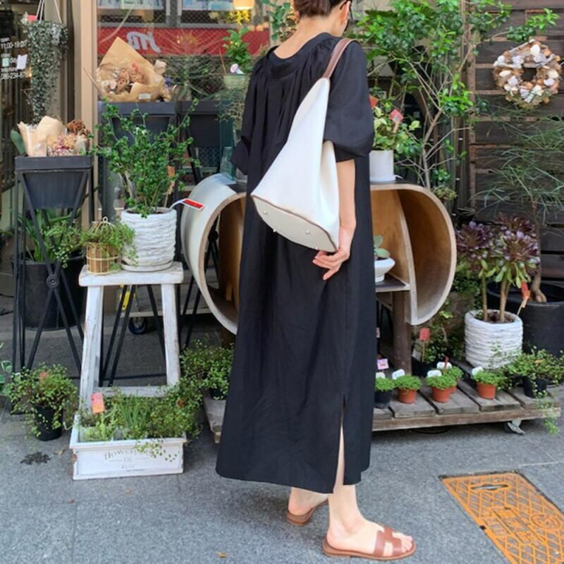 ワンピース 半袖 ロング丈 ブラック ベージュ 黒 春夏 ウエスト aライン きれいめ レディース ロング オフィス カジュアル 韓国 通勤 ゆったりママ 20代 30代 40代 50代 60代 モード系 ナチュラル パーティー オフィス 上品 保護者会 無地 ふわり ぽわん袖 ボタン ガーゼ 袖あり 襟付き 低身長 OP-0028KM