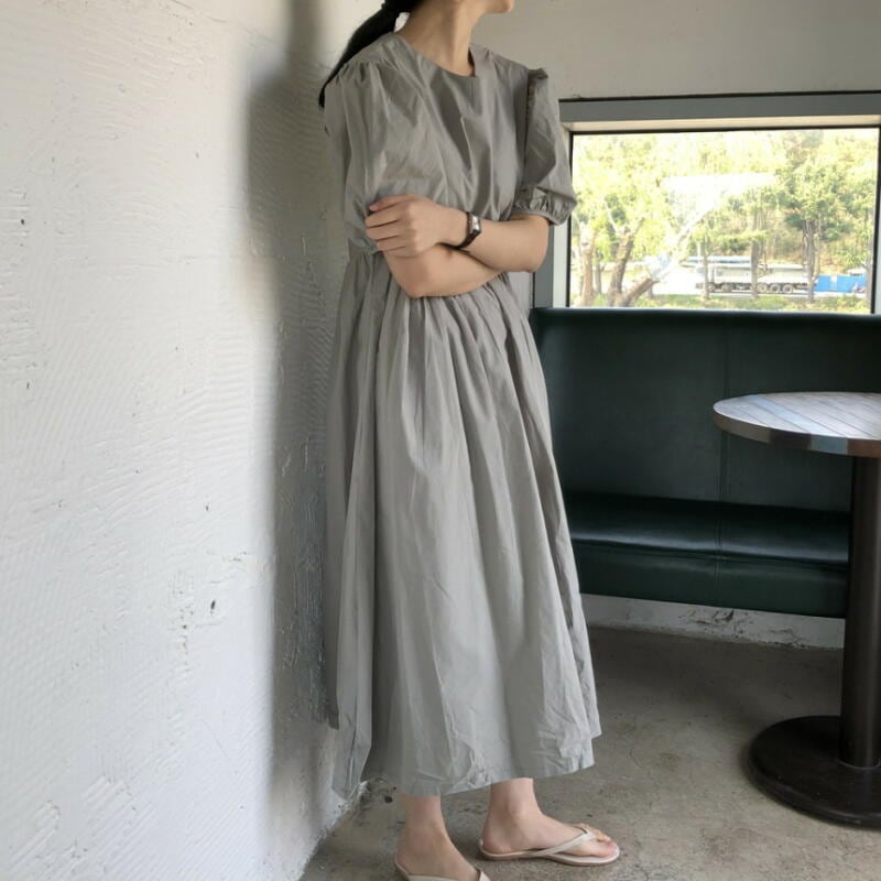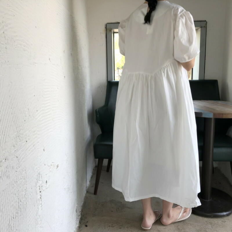 ワンピース 半袖 ロング丈 ホワイト グレー 綿 コットン 春夏 ウエスト パーティー フレア きれいめ レディース ロング カジュアル 韓国 通勤 ゆったり ママ 20代 30代 40代 50代 60代 ナチュラル パーティー 上品 保護者会 無地 ふわり ぽっちゃり ガーゼ 袖あり ボタン ぽわん袖 ボリューム袖 低身長 OP-0037KM
