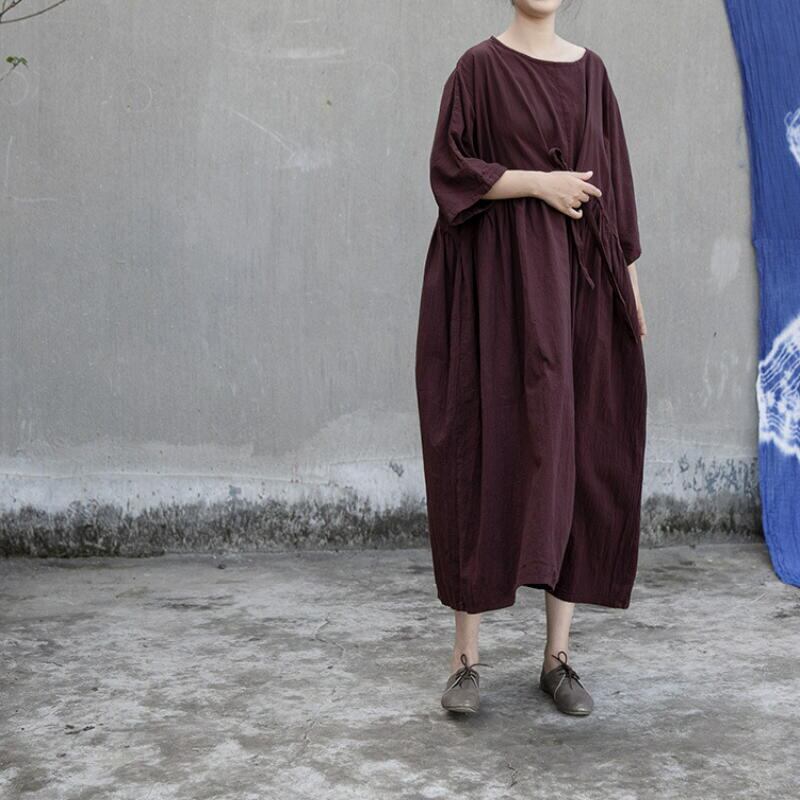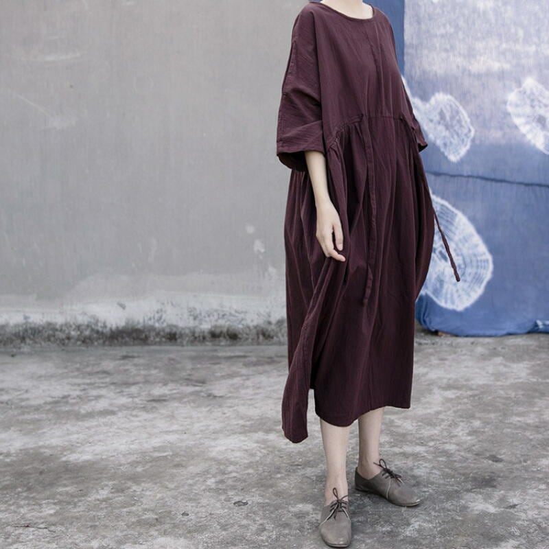 ワンピース 長袖 ロング丈 ダークパープル 綿 麻 コットン リネン 春夏 ウエスト パーティー フレア きれいめ レディース ロング カジュアル 韓国 通勤 ゆったり ママ 20代 30代 40代 50代 60代 ナチュラル パーティー かわいい 上品 保護者会 無地 ふわり ぽっちゃり ガーゼ 袖あり リボン ぽわん袖 低身長 OP-0039KM