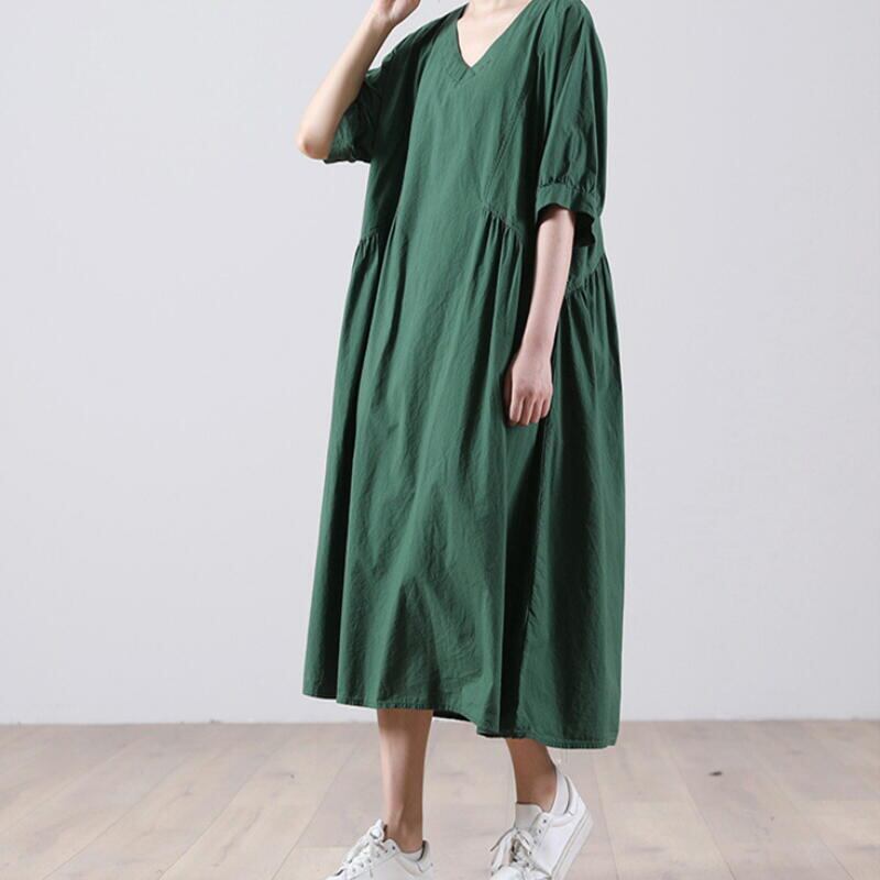ワンピース 半袖 ロング丈 綿 コットン グリーン ベージュ オレンジ 春夏 aライン vネック きれいめ レディース ロング オフィス カジュアル 韓国 通勤 ゆったりママ 20代 30代 40代 50代 60代 モード系 ナチュラル パーティー かわいい オフィス 保護者会 ガーリー 無地 ふわり ガーゼ 袖あり 低身長 OP-0056KM