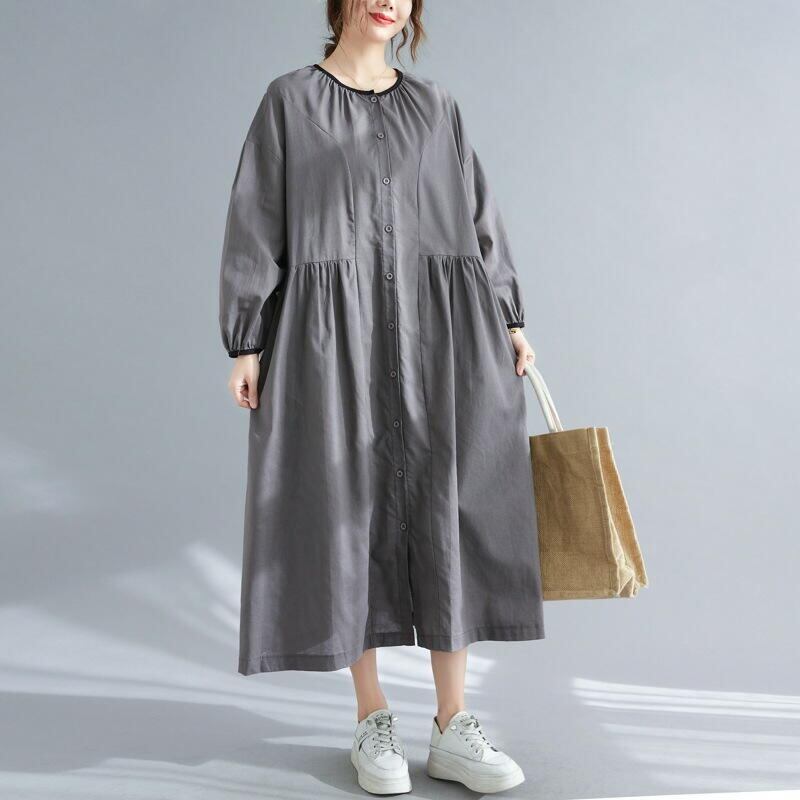 ワンピース 長袖 ロング丈 綿 コットン グレーネイビー 春夏 aライン きれいめ レディース ロング きれいめ オフィス カジュアル 韓国 通勤 ゆったりママ 20代 30代 40代 50代 60代 モード系 ナチュラル パーティー かわいい 上品 保護者会 無地 ボタン ふわり ボリューム袖 ガーゼ 入学式 セレモニー 袖あり 低身長 OP-0059KM